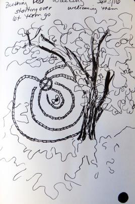On my walk out of the labyrinth I stop and stand while the sun warms my body. I touch the bark of the tulip tree that stands next to the labyrinth. The sun restores me and I become aware of the roots of the tulip tree that wind beneath me, supporting me on this path. We are all held in the womb of the divine mother that this labyrinth form represents.